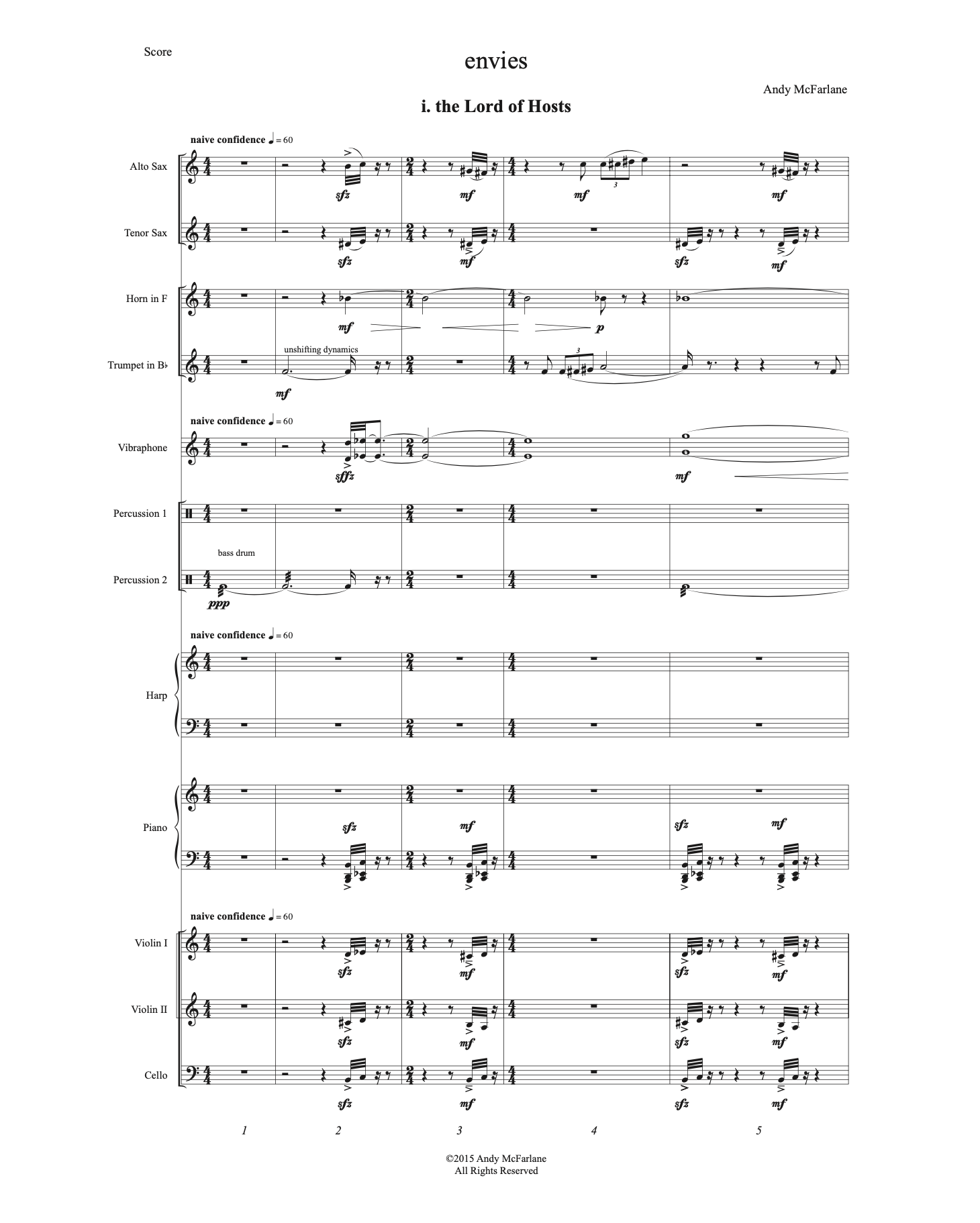 Envies is a musical narrative describing a man’s vision of Jehovah Sabaoth, the God of Israel, and his thought process afterwards. The work is divided up into four movements: the vision of Jehovah, the man’s initial response, his description of humanity’s faults, and an attempt of reconciling this great God with Jesus Christ who proclaimed the mercy and grace of God.